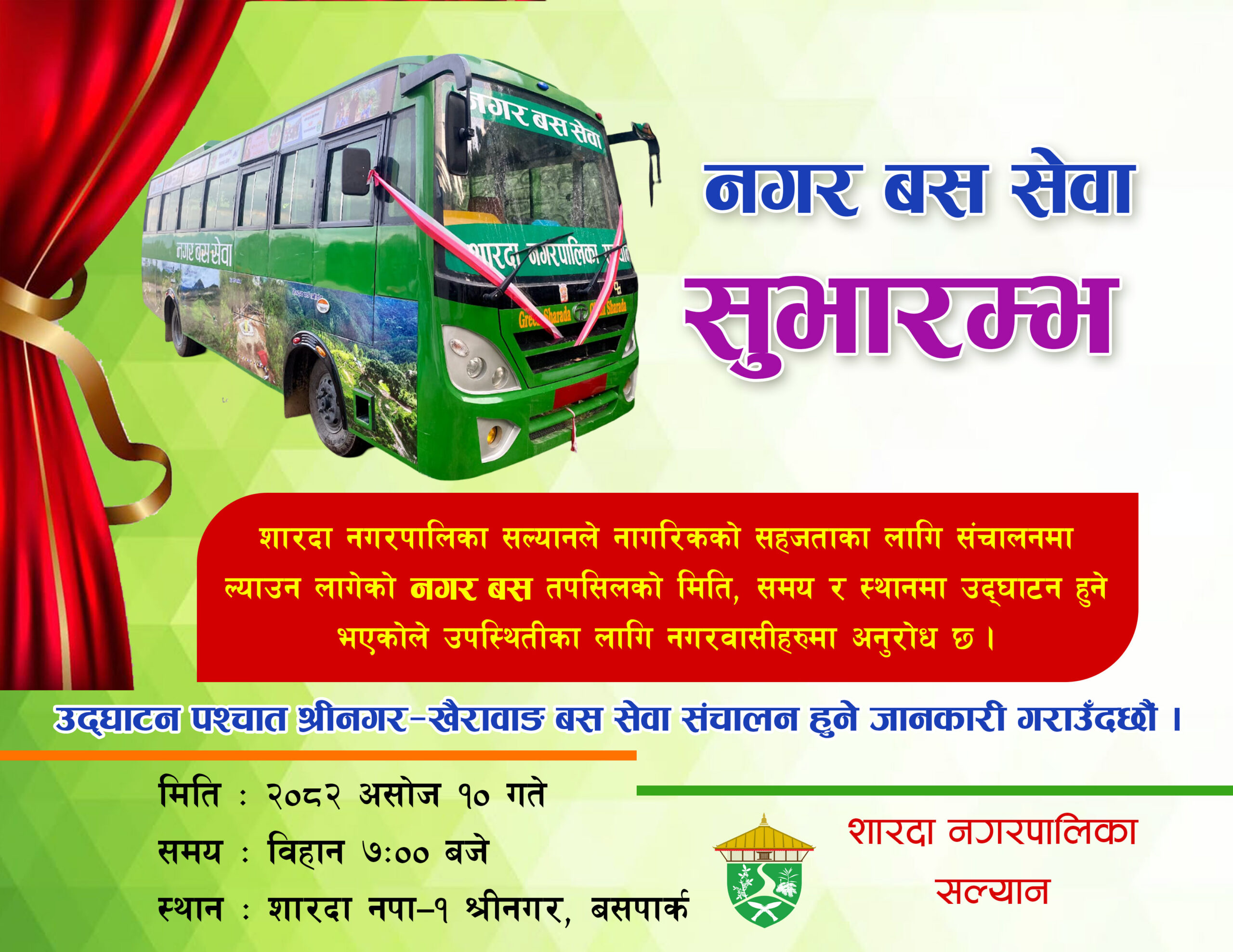 सल्यान । सल्यानको शारदा नगरपालिकाले नगरवासीको यातायात सहज बनाउन नगर बस सेवा सञ्चालनमा ल्याएको छ । नगर बस सेवाको शुभारम्भ असोज १० गते बिहान ७ बजे शारदा नपा–१ श्रीनगर, बसपार्कमा हुने जनाइएको छ ।